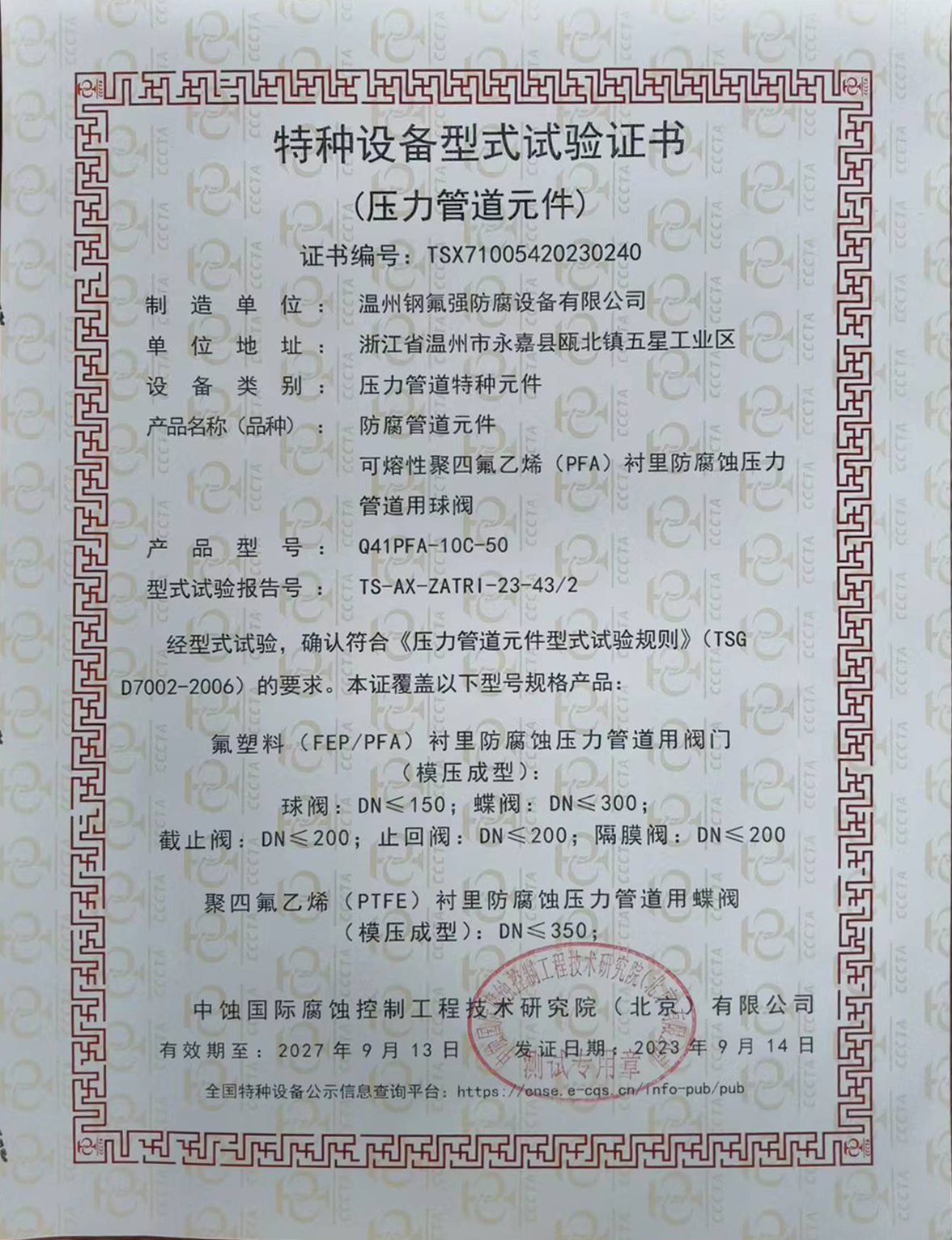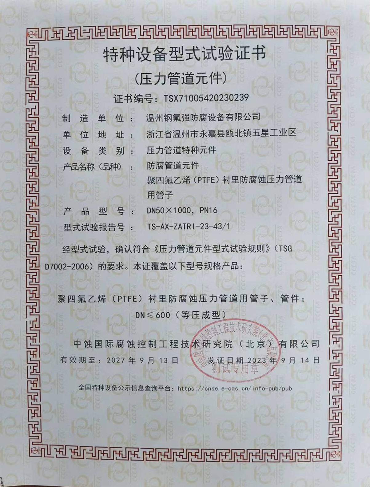 | 特種設(shè)備型式試驗(yàn)證書(shū)(壓力管道元件) |